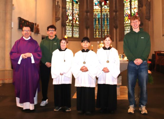 (30.11.2025) Zu Beginn des neuen Kirchenjahres am 1. Advent wurden drei neuen Messdiener und Messdienerinnen in kirchlichen Dienst in St.Stephanus aufgenommen. Propst Andreas Hagemann ging in seiner Predigt auf die Wichtigkeit der Messdiener im Altardienst ein und freute sich das in St. Stephanus 91 aktive Jugendliche im Dienst stehen. Besonders dankte er auch den anwesenden Messsdienerleiter/-innen für die Betreuung und Ausbildung der Messdiener. In den Dienst wurde heute Eva Niermann, Theresa Bernsen und Léon Rehbock aufgenommen. Wir wünschen Ihnen einen gutem Start und Gottes Segen!